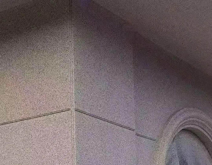 為了讓多彩涂料噴涂效果更接近石材,原則上可采用與石材一樣的分格,比如陰陽(yáng)角分格、窗口分格、樓沿分格。但考慮到石材的局限性,水包砂分格可以不用在陰陽(yáng)角部位進(jìn)行分格,建議可在窗口側(cè)面必須進(jìn)行分格,并注意盡量不要出現(xiàn)小塊、小邊的現(xiàn)象。